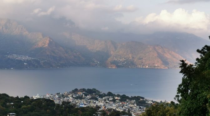 Café terrasse et en avant pour San Pedro de la laguna. Nous pensons prendre un taxi pour la station de bus car nous n’avons aucune information sur le système de busetas ici. Et la chance continue à nous sourire : à peine sorties de l’hôtel j’en aperçois un à l’angle de la rue. Central de camionetas ? Et oui, bingo. Pour un prix 5 fois moins élevé avec le folklore en plus, nous atteignons la centrale de bus par l’autre côté du marché. Valises à roulettes en main nous tentons de nous frayer un passage parmi les légumes, les fraises et les camelots en tout genre. Au moins 500 mètres de parcours en ligne droite qui nous permet de réviser les différentes tenues étudiées hier au musée. Lors d’un passage à proximité de bassines éclatantes de couleurs, Martine s’approche pour en examiner le contenu. Il s’agit de confettis. La vendeuse âgée mais espiègle en saisie une poignée et fait mine de la projeter sur Martine qui s’écarte en riant. Du coup elle s’approche de moi et me la déverse sur le tête. Tout le monde rit et nous poursuivons notre expédition marché. 10 mètres plus loin, la vieille dame qui avait rechargé sa poignée la lance sur Martine. Et voilà nous avons fait la risée de toute cette allée de marché jusqu’au chauffeur de bus. Évidemment repérées par les aides et les crieurs de destination à peine avions nous mis un pied en dehors du marché, que nos valises étaient prises en charge et hissées sur le toit de la camioneta de San Pedro. Une chance de ne pas avoir eu à chercher le bon bus dans ce capharnaüm de couleurs. Départ dans cinq minutes enfin 30. En mode local avec la musique et le cinéma des chargements et des arrêts de livraison nous n’avons pas vu passer les 2h30 de trajet. L’arrivée sur le lac Atitlan à San Pedro de la laguna s’effectue par une descente sans fin ponctuée de virages en épingle à cheveux. Autre coup de bol, notre chauffeur est parfait en comparaison de celui d’avant-hier qui n’aurait jamais réussi à atteindre le village. Nous voilà installées du côté de la plage. Celle-ci s’avère être le lieu privilégié des locaux pour effectuer la lessive et se laver par la même occasion. Décidément toutes les minorités guatémaltèques semblent ignorer qu’elles polluent leur propre environnement. Après un échange avec un gars du coin instruit qui travaille à la recherche volcanique j’oublie mes envies de baignade. Malgré ce désastre écologique, ce lac est une merveille il paraît qu’il est plus majestueux le matin. Mais franchement j’ai du mal à imaginer mieux. Au programme de l’après-midi une belle balade sur la plage à échanger avec les pêcheurs et les agriculteurs du coin. Suivie d’une découverte du centre du bourg où nous ne comprenons pas pourquoi les guides touristiques annoncent ce village comme un lieu de fête. Et un petit tour en tuktuk avec Lucas dont nous avons réservé la journée entière pour demain. Nous voilà de retour dans notre petit coin de paradis entouré de végétation et avec une chambre dotée d’un hamac, d’une terrasse et d’une salle de bain privée. La classe et bon marché de surcroit à 15 euros la nuit petit déjeuner inclus, que demander de plus ?