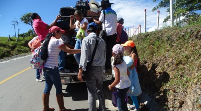 9h45, nous sommes sur site, « regarde Martine c’est le gros 4×4, alors nous avons une place cabine et une en arrière chouette je vais prendre des photos je vais à l’extérieur. » J’attends que les gens s’engouffrent sous la bâche pour occuper une place avec vue. Ah oui mais il n’y en a plus… Bon je grimpe avec mes 5 autres camarades de rappel et en route. Ça secoue sec et je fais comme tout le monde je me cramponne à deux mains. Trois campesinos descendent au bout de 10 minutes super à trois c’est bien plus confortable et on commence à papoter. Là j’apprends que mon voisin, qui m’offre une orange, pas facile à consommer dans ces conditions (mais il me l’a épluchée), a perdu la moitié de sa récolte sur les arbres tellement les cours ont chuté. On continue notre blabla et nouvel arrêt sur la route pour prendre 3 adultes et un enfant. Et voilà pour la dernière demie heure se sera en rappel sur le côté. Au final ce véhicule à 10 places confortables a transporté 22 personnes. Expérience sympa mais la prochaine fois je crois que j’irai tout de suite m’asseoir. Plus de doigts à l’arrivée et en prime une baffe de feuillages quand l’écart de la voiture pour éviter un camion fut trop rapide pour esquiver totalement la branche.