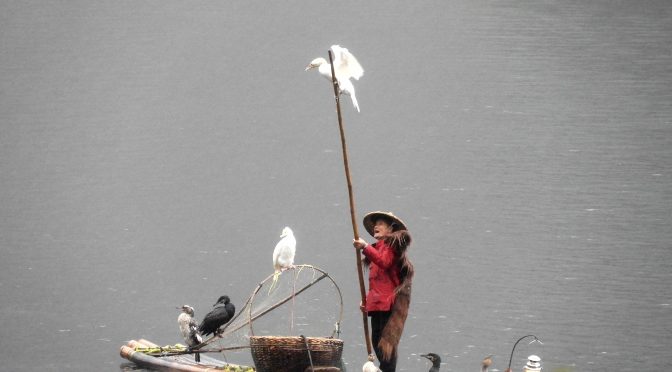 Réveil au son de la pluie ce qui n’encourage pas un lever rapide et dynamique. Nous bouclons nos petits sacs à dos, abandonnons nos valises pour trois quatre jours de découverte du paysage karstique. Nous tentons de réaliser par nous même un circuit que j’ai repéré sur un site de voyage organisé. Petit déjeuner et nous empruntons le même joli chemin qu’hier pour attraper le bus n°3 puis le 5 pour la gare de bus Sud. Nous traversons tout Guilin, moi qui croyais arriver dans un site perdu au milieu des pics karstiques et bien ce sont eux qui se perdent à présent au milieu de la civilisation. Apparaissant de ci de là au détour d’une rue, coincés entre les nuages et les immeubles. Ce que je n’avais pas prévu en prenant le temps ce matin c’est que deux heures vont être nécessaires pour parcourir les 11 km pour atteindre la gare. Ensuite à vouloir nous aider, les chinois vont nous faire descendre deux stations trop tôt puis une autre nous indiquer la gare dans la mauvaise direction. Ce n’est pas dans ce décor austère que nous avions prévu notre entraînement de marche avant nos deux prochaines semaines en montagne ! Enfin la gare est en vue et de petits bus en sortent. Je les arrête tous en montrant en chinois Yangdi, notre destination. Et cela fonctionne puisque nous embarquons pour parcourir la trentaine de kilomètres, cette fois-ci sans bouchon et au pied d’une succession de splendides pics dont la roche se détache de la végétation. Mais l’atmosphère reste résolument tristounette avec ce gris qui les enveloppe. Dommage ! Le bus s’arrête, la chinoise, assistante du chauffeur et encaisseuse s’agite en nous regardant, on descend là ! Oui mais nous sommes juste déposées au beau milieu d’un carrefour. Je la regarde interloquée et elle nous montre du doigt la direction de Yangdi. Bon, bon nous allons nous diriger par là. Je regarde le GPS, il reste 11 km à parcourir. Ah, un arrêt de bus avec une jeune à l’intérieur, Yangdi ? Oui c’est bon, ouf il ne nous reste plus qu’à attendre. Le voilà et ça repart, nous traversons de tout petits villages Puis vient Yangdi où réapparaissent quelques touristes. Nos estomacs se contentent d’une grignote : œuf de cane, riz gluant en feuille de bananiers et clémentines avant d’acheter le billet. Nous nous groupons avec un jeune couple chinois pour partager les frais de notre bamboo boat, enfin plastique boat serait plus adapté… nous enfilons les gilets de sauvetage et en avant pour Xingping. Une heure de descente sur la rivière Li à s’imaginer à quel point ce paysage doit être fantastique par beau temps. Mes chaussures qui prennent l’eau, la bruine qui envahit l’appareil photo et les lunettes et ce froid humide qui nous pénètre enlèvent à cette croisière d’une heure . Il est déjà 16h30 et notre randonnées de 10 km prévue le long de la rivière se transforme en véhicule électrique pendant 7km. Nous descendons tout de même pour observer enfin deviner le point de vue d’où a été tirée la photo figurant sur le billet de 20 yuans chinois. L’occasion d’observer un pêcheur aux cormorans en activité. Pour cette pêche millénaire, on ligature le cou des cormorans d’une ficelle de façon qu’il ne puissent avaler que les petits poissons. On leur masse la tête. Ils sont libres et reviennent d’eux-mêmes sur le bateau. Direction notre petit village super touristique où nous avons la bonne surprise de constater qu’il subsiste de vielles maisons. Voilà notre auberge de jeunesse mais pas de dortoir cette nuit mais une chambre avec vue sur les pics. Séance séchage de chaussures et de chaussettes au sèche cheveux et direction le dîner pour déguster une bonne pizza cuite au feu de bois. Déjà testée en chemin, cette spécialité revisitée par les gens du coin est excellente. Logiquement le programme de demain est au vélo pour rejoindre Huangshuo enfin après avoir pris un bus pour Fuli mais l’offre de scooter à essence à louer à la guesthouse risque de prendre le pas sur le sport et le bus. A ce rythme là je pense que nous allons en baver dans les montagnes !