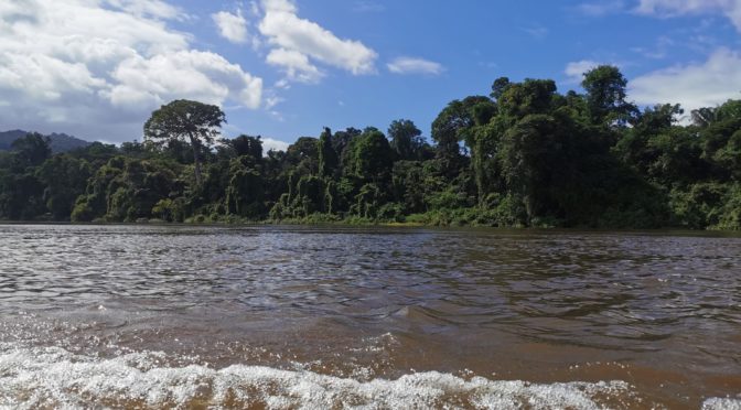 En mode fleuve, le réveil s’effectue en douceur. Tout le monde semble avoir bien dormi jusqu’à ce que Sébastien pousse un cri. Des grosses tâches de sang impriment son drap, deux chauve-souris vampire l’ont mordu au mollet. Il reste se reposer deux heures de plus et visiblement n’a pas perdu de force. A présent nous croisons les doigts pour qu’elles ne soient pas enragées. Avec ce risque chauve-souris connu, je n’avais jamais envisagé de dormir sans moustiquaire et je félicite Dominique d’y parvenir. Une ballade rapide dans le kampu afin d’atteindre l’école pour pouvoir bénéficier de sanitaires. Chouette ! Le temps de quitter notre campement j’ai eu le temps de prendre au moins trois petits déjeuners. Bonne initiative de ma part car à l’époque je ne savais pas que la pause déjeuner ne figurait pas au programme. Nos piroguiers sont pourtant allés relever le filet avec succès et le menu avait été annoncé. Le moteur tourne et les magnifiques images des cebas majestueux qui émergent de la jungle reprennent leur défilé. Le fleuve rétrécit pour notre plus grand bonheur en redoublant cette sensation de se retrouver au milieu de nulle part . Ah voilà les chinois, et de un et de deux, et de trois, courses à faire ou pas, envie de bières ou pas, nos piroguiers y font une escale systématique. Nos arrêts s’effectuant du côté du Suriname nous pouvons observer que le côté protestant du fleuve est plus propre. Dans un, des amérindiens étaient présents donnant un air latino collant merveilleusement à l’environnement, Dans un autre, des dominicaines venues égayer le week-end des orpailleurs m’interpellent quand au mode de passage du virus brésilien via le Suriname en Guyane.