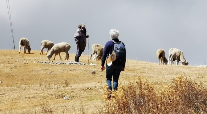 Le coq sonne l’heure une première fois à 5h30, je lève le rideau il fait noir. Retour sous la couette puis il exécute un premier rappel à 6h30. Je lève le rideau, la brume ensevelit tout l’hypothétique paysage. Retour sous la couette et au troisième rappel à 7h30 froid et brume sont toujours là mais cela sent le petit déjeuner. Nous traînons à table, seules clientes de l’hôtel, la famille nous tourne autour, la grand-mère en tenue traditionnelle me tire la joue avec un grand sourire en me disant ça y est, elles sont levées. C’est sûr tout le village est déjà dans l’église. Un petit tour sur la terrasse de l’hôtel où nous rencontrons notre réveil matin attaché à une ficelle. Les montagnes commencent à apparaître, nous prenons la direction du buseta, le nom du collectivo ici. Nous voilà assises à bavarder avec les autres futurs passagers. Certaines familles désormais sorties de la messe viennent nous saluer. Le temps s’écoule doucement mais les nuages restent comme nous plantés sur place. Enfin, un buseta fait son apparition. Assises sur nos sacs, nous traversons des vallées toutes différentes dont les couleurs éclatent à mesure que les nuages eux aussi en marche disparaissent. Première escale à los Tres Caminos, c’est facile de trouver les noms des arrêts ici, vous comptez le nombre de routes au carrefour et c’est gagné. Hop ! on regrimpe mais pour juste une dizaine de minutes. Lorsque la route est revêtue, cela change la donne. Évidement le chauffeur n’a pas de mal à nous prendre pour des touristes et nous dépose sur le chemin qui mène au mirador. Valise à la main, je demande à la première maison venue s’ils acceptent de nous les garder et évidemment c’est un oui souriant qui nous est accordé. Une petite balade, le mot randonnée serait trop fort, même si déjà ça grimpe dur, et retour au point zéro où nous attendons un taxi en compagnie de dindons pour rallier notre hébergement ranch. Loin de l’idée que je m’en faisais, nous voilà logées dans une maison pleine de charme à la décoration raffinée. Évidemment l’épouse du propriétaire est française. Les écuries de luxe, elles aussi, hébergent une quinzaine de chevaux. Trop tard pour une randonnée ce sera donc une nouvelle grimpette face aux volcans toujours un peu dans la brume. Ce soir c’est une soirée française qui nous attend puisque les autres convives sont également français. Avant le dîner une petite partie de scrabble et apéro bien-sûr !