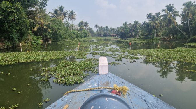 Debout de bonne heure pour profiter du lever du soleil. Nos yeux sont rivés sur le lac mais je dois avouer qu’il ne se passe pas grand-chose. Ce n’est pas bien grave car le petit déjeuner ne tarde pas à arriver. Un peu avant 9h notre plan de bateau en main nous grimpons dans un richkaw en direction de notre point de départ du ferry qui va nous conduire à 10 km de Kumarakom. 9h20 le bateau accoste pour un départ à 9h35 précise comme annoncé. Ensuite nous ignorons le temps de navigation pour atteindre notre destination, Panjiram. Deux bonnes heures vont être nécessaires pour parcourir la dizaine de kilomètres à travers les canaux. Nous avons vraiment apprécié la partie cernée de rizières et à chaque arrêt on se demandait d’où venaient les gens. J’ai aperçu par endroits des bâches tendues et je présume qu’ils devaient vivre là. Nous voilà débarquées à la recherche d’une rue qui monte en espérant y croiser des richkaws. Quelques centaines de mètres plus tard nous atteignons un village où à l’abri du soleil 4 chauffeurs bavardaient. Super un seul nous suffit. Les filles me demandent si je connais la destination. Évidemment et je communique le nom de l’hôtel au chauffeur. Nous traversons quelques villages installés paisiblement le long de canaux et arrivons devant un magnifique resort. Le garde à l’entrée nous regarde bizarrement mais laisse passer notre richkaw très fier de pénétrer à l’intérieur probablement pour la première fois. Là nous recevons la bénédiction de bienvenue et l’on nous prie de nous installer confortablement à une table pour l’enregistrement. Comme j’ai effectué la réservation hier après avoir annulé celui de la plage, je me rappelais de cet établissement. Évidemment on ne trouve pas notre réservation et pour cause : ici c’est la version Lake mais le nôtre c’est Park dans le nom. Juste 500 euros d’écart pour la nuit. Alors évidemment les gens arrivent en taxi ou en bateau privé mais pas en tuktuk. Le nôtre n’est pas loin, je le repère sur Maps me, le GPS alors en avant à pied. Nous pénétrons dans un simili de village avec des gens accueillants mais à l’endroit indiqué rien, le vide. Bon changement de GPS et Google pour une fois semble indiquer la bonne direction. Et bien les filles, c’est sur la grande route et nous sommes allés trop loin. Il fait une chaleur de dingue et j’évite de me retourner car je pense que je suis doublement bénie. Trop soif, alors escale dans un bouiboui pour boire une noix de coco et la manger. C’est reparti nous voilà installées dans un hôtel luxe au niveau des chambres mais évidemment qui n’a pas le charme des petits bungalows face au lac. Martine est habituée à ce genre de plan mais pour Corinne c’est une première. Avec tout ça il est déjà 14h30 alors à table. Le restaurant de notre hôtel est excellent mais sous la climatisation il fait un froid de gueux. Une bonne séance piscine et il est déjà l’heure d’envisager où dîner. Pas trop d’hésitation nous retournons au super hôtel un peu tard pour le coucher du soleil mais avec une vue magnifique en terrasse extérieure. Une bonne petite dînette version cocktail et tapas de crevettes et de calamars clôture cette bonne journée. Demain au programme c’est marche à pied car le cadre si prête bien. Et quand même nous avons réservé pour samedi midi le restaurant poisson pour notre dernier repas avec Corinne.
