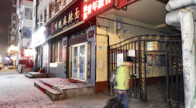 À mesure des arrêts on sent la température qui baisse à l’extérieur. Harbin, terminus du train, on descend, je hume l’atmosphère et non, nous ne sommes pas saisies par le froid. Bon c’est vrai que le quai de la gare est couvert. Une heure et demie plus tard nous atteignons notre destination en taxi. Il est au environ de 23h et dans l’auberge, hormis la patronne, seuls un couple de français et deux étudiantes françaises également nous accueillent chaleureusement. Et voilà c’est parti pour une causerie jusqu’à 2h du matin. Nous sommes gâtées le thermomètre affiche un moins 10 contre un moins 20 hier.