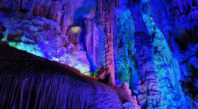 Voilà nous avons la réponse concernant la météo ce sont les pires prévisions qui l’emportent avec fraîcheur, ciel couvert et pluie. À peine descendues du bus, nous sautons dans un taxi pour rejoindre notre hôtel plutôt luxueux. Nos téléphones n’ont plus de 4G et sans internet pas évident de prévoir un itinéraire en bus. Les prix ici sont attractifs alors nous en profitons. Avec cette météo, le confort cela réchauffe. Une bonne douche chaude et en avant pour la grotte de la flûte enchantée. Excellente nouvelle, nous sommes en retrait de la ville et seulement deux kilomètres nous séparent de notre objectif. Les deux autres bonnes surprises c’est que la pluie reste suspendue aux nuages et qu’un chemin entièrement fléché nous indique notre destination. Une escale casse croûte et nous voilà à l’entrée juste avant la pluie. Martine était sceptique concernant mon choix de grotte éclairée de toutes les couleurs. Mais dès les premiers mètres parcourus dans la grotte, la splendeur de ses stalactites et de ses stalagmites mises en relief par des projecteurs multicolores l’ont, tout comme moi, envoûtée. Longue de 500 mètres, elle vous emporte dans un déambulatoire féerique. Les formations qui se reflètent dans l’eau sont magiques et les chinois ont même mis en place un voile dans la voûte principale sur lequel sont projetés des danseurs qui évoluent au son de la musique du lac des cygnes. Considérée comme «un palais des arts de la nature », elle est en effet somptueuse et la bonne heure et demie que nous avons passée à la parcourir fût un vrai régal. Une fois sorties, nous cherchons un arrêt de bus et, plan de la ville en main, nous vérifions avec les chinois qu’il va bien nous conduire au centre de Guilin. Petit tour de ville sans manquer les pagodes de la Lune et du Soleil qui sont reliées entre elles par un tunnel sous le lac, des grignotes et retour à l’hôtel pour organiser la suite de notre voyage, enfin… réserver quelques trains. Mais déjà, nous ne sommes pas les premières et dans une semaine nous aurons le droit de voyager assises toute une nuit les couchettes étant complètes… En revanche sur le papier nous avons demain un programme bateau pour rejoindre le village où nous avons réservé notre hébergement. Mais toujours aucune idée de l’heure du bus pour rallier le village du départ des bateaux. La seule information que nous possédons c’est qu’il en existe trois par jour. A suivre…