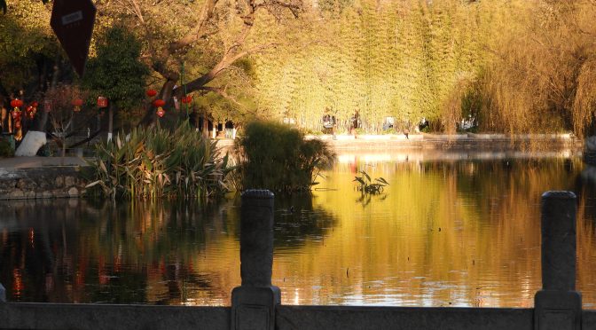 Un petit tour de train, 1000 kilomètres plus loin et déjà 10 degrés de plus! C’est la fête ! Arrivées en gare de Kunming, nous étudions la sortie pour trouver le métro et nous voilà en direction de la gare routière. Alors un petit coup de traducteur pour écrire en chinois le nom de notre prochaine destination et on fait la queue. Les vacances de nouvel an viennent de commencer et déjà nous voyons la différence. À présent nous comprenons à quoi servent les dizaines de mètres de barrières que l’on observait toujours vides devant les guichets, entrées de gare ou de métro. Hop hop hop, on ne me double pas. Et voilà notre premier ticket de bus est dans la poche, plus de départ aujourd’hui ce sera donc pour demain matin. À présent il nous faut un hébergement pour la nuit. Alors que faire à Kunming ? Ah oui regarde, il y a un parc aménagé en lac. On repère une auberge de jeunesse à proximité et hop le métro pour une heure. Nous y voilà, le temps de poser les sacs et nous nous dirigeons vers le parc juste avant le coucher du soleil. C’est dimanche et visiblement tout le monde profite de l’endroit. Tous les 20 mètres, groupes de danseurs, groupes de musiciens ou solo y vont de leur instruments ou laissent s’échapper de leur enceinte une musique entraînante. C’est un peu une caquofonie vue de l’extérieur mais dés que l’on s’approche on arrive clairement à entendre un groupe à la fois. Je suis dégoutée car j’aurais volontiers participé à quelques pas de danse mais mon lumbago est déjà douloureux rien qu’à marcher. D’ailleurs Martine a repris son emploi de mule aujourd’hui. On profite de cette ambiance avant de faire une halte dîner. Super, changement de décor signifie aussi nouveauté culinaire. Hummm de bonnes crevettes cuites avec des légumes dans une feuille de banane. Enfin la banane était en aluminium mais cette papillote était excellente. Et comme dessert un jus de coco avec du riz juste génial. Voilà maintenant nous sommes posées dans nos super lits superposés avec une voisine écossaise et une française. Pour une fois qu’on trouve une française, elle n’est pas très agréable… Demain on poursuit la route et nous resterons quelques jours tranquilles. Bonne journée à tous et bonne reprise de lundi aux travailleurs !