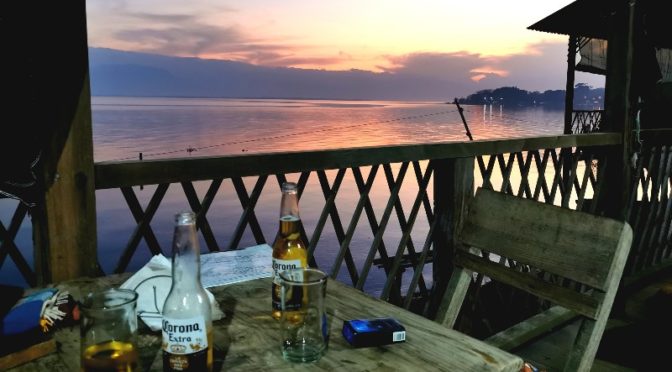 Comme tous les jours en s’installant pour le petit déjeuner au soleil face à un décor magique, on se regarde et on se dit, on n’est pas mal ! Un autre petit café sur notre terrasse privative et on se motive. En avant les pagaies, Martine grogne un peu parce qu’apparemment je ne vais pas droit. Moi je pense que c’est à cause du vent. Enfin nous atteignons le fort, un regard sur la montre 40 minutes ont été nécessaires, pas le temps de partir explorer l’intérieur. Ni même de faire des photos depuis la terre dixit le gardien qui s’égosille à répéter que ce n’est pas permis. Hop retour à la base avec une pause hamac puis la lancha pour Rio Dulce. De là nous prenons un collectivo pour El Estor à l’autre bout du lac d’Izabal. Une heure en mode sardines avant d’atteindre la place centrale où Sergio vient nous récupérer avec son 4×4. Nous sommes à présent beaucoup plus isolées avec pour compagnie deux chiens , deux chats, des canards, des oies, des poules, des coqs et des iguanes. Logiquement le réveil est assuré pour demain matin. Cela tombe bien car nous partons de bonne heure en expédition lancha. Tous les autres touristes sont guatémaltèques. Sergio et sa femme ne diffusent que de la musique de jazz qui cadre parfaitement avec cette atmosphère sereine. Nous déjeunons tardivement sur la terrasse piscine avant d’installer nos hamacs à l’ombre de notre chambre. Le lieu regorge de passerelles et de terrasses. Les plus grandes sont occupées par les locaux visiblement en séminaire à tendance religieuse. Déjà l’heure du coucher de soleil… cela signifie apéro ! Ici point de cocktail et de vin mais la Corona est au frais, tout va bien. Et les grosses crevettes à l’ail sont excellentes, je me régale. Martine aussi avec sa salade mais le chat roux préfère mon menu. Mauvaise nouvelle notre guide prévu pour demain est en fait déjà pris mais comme nous insistons Sergio nous dégote un gars du village. Espérons qu’il saura nous trouver les lamantins que nous sommes sensées observer. Dans tous les cas notre sortie nature devrait être magnifique.
