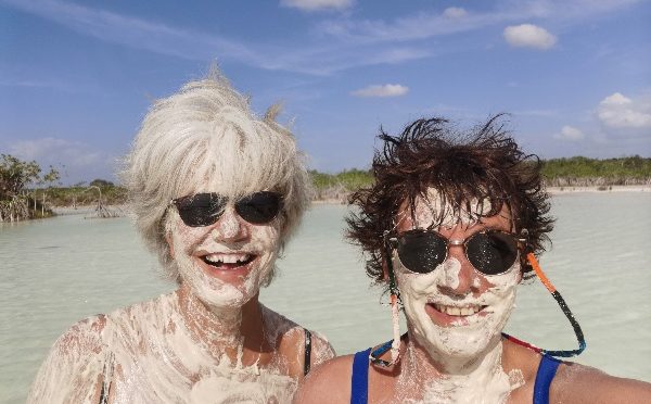 Avec notre décalage horaire d’une heure nous n’avons pas de difficulté à nous trouver sur le ponton pour le lever du soleil. Premières et seules pour le petit déjeuner dans ce superbe décor nous profitons en douceur de l’endroit. 9h30, c’est Franklin qui sera notre chauffeur de taxi du jour. Départ pour une première découverte de la lagune aux sept couleurs parce que sept nuances différentes de bleu peuvent être distinguées entre ses eaux, en raison des différentes profondeurs à l’intérieur de la lagune. Nous voilà à Los Rapidos un peu trop rapidement d’ailleurs puisque le site n’est pas encore ouvert. Résultat le gardien nous laisse passer puisque nous sommes désormais à pied, loupé l’avantage du taxi ! Il va falloir marcher trois kilomètres. Ok nous allons nous en remettre d’autant que le dernier nous l’avons parcouru en stop. Et nous voilà en mode transat devant ce bras de lagune qui se compose essentiellement de stromatolites. (Lire plus bas). Le courant est génial et l’on s’amuse à se laisser dériver puis à regagner la terre pour le remonter et recommencer. C’est génial et ,en plus, entre plusieurs descentes, le déjeuner est servi. Une petite sieste séchage et nous téléphonons à Franklin afin qu’il vienne nous récupérer. C’est que le programme est chargé, nous avons catamaran à présent. Halte à l’hôtel pour récupérer un pull car le vent se lève et zut ! la sortie est annulée à cause du vent. Pas de panique juste quelques mètres à parcourir et nous voilà moins d’une demi-heure plus tard à bord d’un bateau à moteur pour découvrir les secrets de la lagune. Et pouvoir vérifier l’expression maya d’où vient le nom de Bacalar. Il s’agit de « Sian Ka’an Bakhalal », qui signifie « lieu de naissance du ciel ». Et bien même si les nuages ont quelque peu perturbé les couleurs j’acquiesce la vision maya. C’est juste splendide, l’eau est chaude, les nuances de bleu renforcés par les trois cénotes différents qui en débordant ont composé la lagune, sont magiques. Notre dernier point de baignade à côté du passage qu’empruntaient les pirates pour pénétrer dans la lagune, en face du fort, nous permet de nous offrir un soin du visage avec un sable soufré et étonnamment fin. Retour sur la terre ferme avec une escale smoothie mangue fraise orange et direction la douche. Enfin pour moi, Martine veut conserver les bienfaits du masque maya. Je vous écris ce petit mot et hop c’est déjà l’heure de l’apéro. Alors à demain les amis. Et vous savez quoi ? Comme on n’est pas mal nous venons de signer pour une nuit de plus…