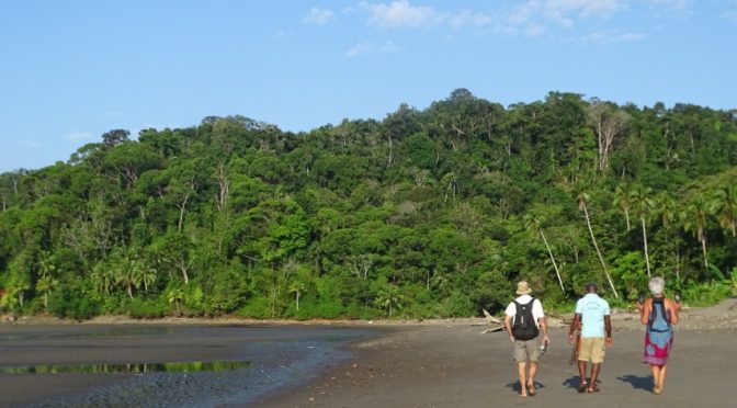 Réveil entre un mixage du chant des oiseaux et des ouvriers qui construisent une extension de notre hébergement. Tita qui entend que nous émergeons se lance immédiatement dans la confection du petit déjeuner. Nous le dégustons face à la lagune et hop ! Olivio commence à descendre son canoë en bois. Nous embarquons non sans mal, pas question de bouger sous peine de chavirage. Je ne sens pas mon appareil photo en sécurité et du coup je l’enferme dans mon sac étanche. Une mini traversée du rio, une petite marche sur la plage et nous serpentons le long d’un ruisseau cristallin jusqu’aux retenues d’eau thermale. Deux petites piscines nous attendent. La plus grande contient une eau à 37°C et l’autre à 47. Tout en bavardant, nous profitons tous les trois, Martine, Vincent et moi de l’endroit avant de retrouver notre village. Entre temps c’est l’invasion deux couples, des hollandais installés dans une maison d’hôtes et des allemands dans le même hôtel que nous, ont fait leur apparition. Nous partons tous les trois avec pour objectif : boire un café, acheter des mangues, de la lessive et des cocos appelées ici pipa. Hé bien cela nous a bien occupé deux heures. Déjà chaque épicerie (et pour l’endroit, elles sont nombreuses) ne vend que quelques produits distincts des autres pour rester dans cet esprit communautaire. Et comme rien n’indique leur présence même si le village n’est composé que de 5 ou 6 axes différents dans moins de 500 m2, cela nécessite un bon nombre d’explications. Pour la coco, des enfants nous conduisent chez une dame qui va les faire tomber de l’arbre. Pour le café, comme les bars ouvrent à l’heure de la bière, c’est un particulier également qui nous propose de le préparer et nous le sert sur un espace bar situé au milieu du village . Une rencontre sympa avec deux jeunes militaires qui nous confirment la présence de groupes armés style narco trafiquants en guérilla avec des milices politiques. Quand je lui demande de m’expliquer il lève les yeux au ciel et me dit « ça fait 70 ans que ça dure. » Les hostilités ont repris depuis un mois car les élections approchent et l’argent de la drogue est davantage convoité sur cette période. Bon, un salut et nous poursuivons notre chemin. Une pause baignade et le déjeuner avec poissons nous attend. Pour l’après midi, hamac pour Martine, lit pour Vincent et plage pour moi avec observation des crabes du coin. Retour à l’hébergement et départ vers l’extrémité du village. Après une centaine de mètres nous tombons sur le camp militaire. « Bonjour je suis Esteban, marine nationale de Colombie. » « Bonjour, Isabelle et Martina touristes de France. » Voilà interdiction de les photographier mais on peut passer. Un coucou à notre jeune soldat sympa de ce matin qui nous dit que Vincent est passé par là il y a une heure et nous poursuivons le petit chemin qui nous conduit à travers les citronniers, les cocotiers, les ananas puis la jungle. Là Martine n’a plus envie de me suivre car le soleil est couchant. Bon d’accord on bifurque vers la plage à la prochaine ouverture. Elle tarde à arriver à son goût mais voilà une sortie sauvage que nous empruntons pour arriver sur la plage au moment où le soleil sombre dans la mer. Retour par le village pour la petite bière du soir et soirée tranquille avec Vincent, les deux allemands se préparant eux même leur dîner.