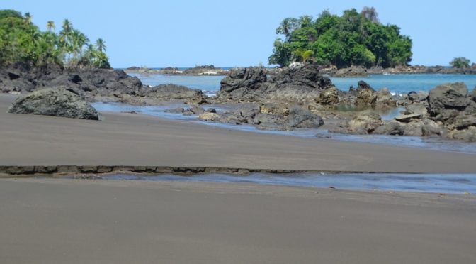 Après un petit déjeuner copieux enfin pour moi… car à force d’être trop servi j’ai mangé la part de Martine mais je lui laisse mes fruits sans contrariété car j’ai des aphtes. Départ pour le surf loupé car pas de vagues adéquates ce matin mais nous retrouvons nos deux françaises installées dans l’hébergement des surfeurs juste avec un autre couple de colombiens. Donc 6 touristes en tout sur cette plage de 8km. Ça va on ne devrait pas se gêner. Séance papotage : non seulement Anélice (je l’ai déjà écrit) est amie avec un ancien élève de Martine mais le frère de Joséphine, Pierre Louis est ami de Erwan, le fils de notre amie et factrice préférée. C’est drôle. Retour au lodge pour prendre notre matériel de snorkeling et direction le bout de la plage qui forme une anse pour trouver la zone calme. Loupé aussi, la visibilité est certes meilleure mais les poissons sont absents alors ce sera une petite bière face à la mer en compagnie d’une petite piplette de cinq ans adorable. On a même joué à la poupée, Martine a eu la sirène. L’estomac sonne un retour vers notre hamac en attendant le déjeuner. Les lits ont été refaits, le sol et la salle de bain nettoyés, la moustiquaire relevée ainsi que les rideaux. Martine s’inquiète de ma compréhension du prix. Bon on verra ce soir. A table ! Fernando a pêché avec succès ce matin alors ce sera soupe de poisson et poisson pané maison, excellent. Une petite sieste hamac s’impose mais de courte durée car nos voisines sont venues nous visiter. On repart voir l’état de la mer et à cause du papotage on arrive à la fin du créneau de la session ! alors direction la cascade de l’amour qui se niche juste à côté de notre hébergement et c’est déjà l’heure de la douche avant l’apéro. Décidément le temps passe vite à contempler. Heureusement que nous repartons demain car bientôt nos traces de déplacement sur la plage vont ressembler à celles des locaux.