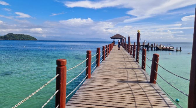 A l’approche du déjeuner, en début d’après-midi, nous avons migré vers la piscine qui tout comme la plage nous était totalement dédiée. Vue le peu d’affluence nous avons du coup pu demander à être servies face à elle. 16h notre bateau vient nous récupérer pour retourner à Kota Kinabalu. De la mer on voit clairement que cette ville tout en longueur est cernée par la mer et la jungle.