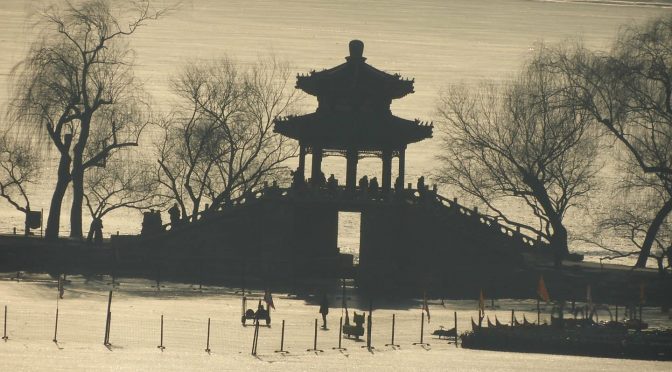 Voilà une des portes d’entrée de cette ancienne villégiature des empereurs chinois qui fuyaient la fournaise estivale de la cité impériale. Nous ce n’est pas le cas. Ce palais d’été est une merveille de conception, avec un extraordinaire mélange de temples, de jardins, de pavillons, de lacs et de ponts. 290 ha dont 220 couverts par le lac Kunming, 3000 édifices, 420000 arbres. Commence une expédition où les marches qui s’enchaînent desservent des temples de toute part. C’est juste magnifique et les pins apportent une couleur verdoyante qui commençait à manquer dans le paysage citadin. Malgré les apparences, ce décor grandiose n’a rien de naturel. Tout a été créé par l’homme, même les collines ont été modulées avec la terre draguée pour creuser le lac totalement gelé. On s’amuse à observer les gens dans différents types d’embarcation qui glissent tels des gosses sur cette étendue cernée de temples. Évidemment je veux y aller aussi. Mon dos toujours endolori me fait hésiter, le prix de la plaisanterie laisse à penser qu’il n’est pas au programme mais joker, nous avons une enveloppe plaisir offerte par nos amis qui se reconnaîtront. Alors, hop un petit traîneau électrique avec des chiens en peluche semble approprié à mon dos. L’air de rien il va vite et chaque virage finit en dérapage incontrôlé en arrière, j’adore. Un peu de vigilance pour se déplacer à pied sur la glace et mon dos n’a rien senti de l’expérience. On poursuit la visite le long du lac qui nous conduit au bateau de marbre qui s’inscrit totalement dans le paysage à cette saison.