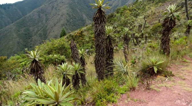 7h nous retrouvons la famillia eco verde au complet mais entre les départs et les malades notre groupe de 19 vient de tomber à 10. Des au revoir chaleureux et nous montons dans un premier bus pour Duitama pour en o un nouveau et nous voilà à destination. Nous pénétrons dans Une forêt dense et humides où les plantes endémiques de cette région foisonnent. Le sentier va serpenter le long de la rivière alimentée par la cascade que nous allons découvrir après quelques efforts de grimpette. Et là cette randonnée haute en altitude et en couleurs va nous conduire à mes fameuses frailejones (Espeletia en français, plantes endémiques du paramo). Ce sentier écologique bien aménagé ne nous a pas épargné lorsqu’il a fallu parcourir le dernier kilomètre avec un montée à 80%. Mais quelle vue ! Du coup entre cascades, forêts d’eucalyptus, pierres colorés, frailejones, montagnes et rigolades c’est à ce jour notre plus belle ballade. Ce qui ne gâche rien c’est qu’elle s’est terminée par une petite grillade dans un restaurant bouiboui qui nous a servi la viande cuite par les familles installées en piquenique de fin de semaine en face. Enfin quand je dis petite c’est un euphémisme il y en avait pour 10 dans une part.