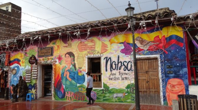 Qu’il est doux de ne rien faire sous le soleil. On profite de ce charmant endroit qu’est notre finca à présent désertée de tous ses occupants pour organiser la suite. Tant pis pour la pluie annoncée depuis que j’ai vu qu’il fait plus de 25°C sur notre prochaine destination. Je viens d’appeler notre contact communiqué par la famillia eco verde et nous sommes donc attendues demain soir. Super ! Il nous reste à savoir quel bus va pouvoir nous y conduire. Direction Sagamoso pour les informations et pour visiter le musée archéologique Muisca (communauté précolombienne). Changement de temps sans prévenir évidemment nous avons oublié nos parapluies. Bon en route pour Nobsa, un petit village à une trentaine de kilomètres d’ici. Nous voilà au pays des ponchos, dommage il est trop tôt dans notre voyage pour s’encombrer. Ici l’ambiance fête de fin d’année perdure avec des décorations hautes en couleurs qui semblent plaire autant aux adultes qu’aux enfants.