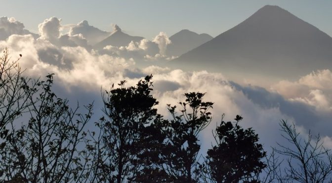 Vraiment heureuses de notre trouvaille, notre petit hôtel avec son jardinet au calme et sa super équipe rien qu’à notre service c’est le top. Vers 9h nous partons pour la visite guidée de la ville. Accueillies par Claudia nous entamons la visite en compagnie de deux jeunes allemandes. Un peu d’histoire, d’architecture, d’artisanat et spécialités culinaires ponctuent le trajet. A savoir l’église de la Merced et son couvent, l’arche Santa Catalina qui a toujours résisté aux tremblements de terre, la place centrale, la Cathédrale qui n’en est pas une, la mairie, l’ancien bâtiment militaire aux armoiries espagnoles, le Palacio Capitanes, l’université de San Carlos qui fut la première au Guatemala, les œuvres sociales du frère Pedro (grâce à qui les soins restent gratuits au Guatemala), les ruines de Santa Clara, le lavoir, la rue de los pasos et l’église San Francisco. Sur cette dernière, une coquille sur un des murs attire notre attention. Enfin nous venons de réaliser que St Jacques de Compostelle dit Santiago en espagnol a donné son nom à Santiago de Cuba, à la capitale du Chili et à la première capitale du Guatemala autrefois Santiago de los caballeros nommée aujourd’hui Antigua. Sous entendu la vielle capitale puisque suite aux différents tremblements de terre qui ont détruit la ville les espagnols se sont éloignés des volcans en construisant Guatemala City, la nouvelle capitale. Notre tour se termine à proximité de notre hôtel, il est déjà midi et demie ; je profite du manque d’énergie de Martine pour la décider à m’accompagner au volcan Pacaya un des trois actifs du Guatemala. Génial nos petits gars de l’hôtel nous gèrent la réservation au tour organisé. Nous n’avons plus qu’à passer à table et à changer de chaussures pour la grimpette. Un mini bus passe nous prendre à 14h. A 16h nous atteignons la destination après avoir traversé quelques villages. Commence alors la grimpette de deux heures pour atteindre le volcan. Il est possible d’effectuer la randonnée à cheval, les gars nous repère Et un cheval taxi va suivre Martine jusqu’au bout mais au grand désespoir de son maître, Martine va réussir son ascension comme une grande. Le dernier tiers s’effectue avec une vue magistrale sur le volcan qui grogne tout en crachant sa lave qui rapidement se transforme en un bruit sourd de pierres qui dévalent son flanc dans un nuage de fumée. Autant vous préciser qu’il n’y a pas que lui qui crache. Je pense que j’ai évacué bière, cigarettes et excès de nourriture de ces derniers jours, en bref je suis prête pour refaire le plein. Alors que nous pensions être à destination , nous sommes descendues sur la lave pour permettre à nos deux guides de nous cuire des chamallows dans un four improvisé. Vite éliminés les chamallows car ce n’est pas le tout de descendre il a fallu remonter avant de réemprunter le même sentier qu’à l’aller mais cette fois ci à la lampe torche. Le coucher du soleil sur El fuego 3763 mètres, le volcan actif dont nous avons pu déjà apercevoir les éruptions depuis le mirador de Unicornio, Agua 3766 mètres, Acatenango 3976 mètres et l’éruption permanente de notre petit Pacaya 2552 mètres furent un tel spectacle que Martine ne regrette en rien les efforts fournis. Retour à l’hôtel à 20h30 un bon poulet purée avec une petite bière et une bonne douche chaude (ce qui est rare ici) pour terminer cette excellente journée. Demain est un autre jour et nous avons eu la mauvaise surprise en rentrant ce soir d’apprendre que notre mini bus confortable pour touristes était annulé car nous n’étions que deux à vouloir partir dans cette direction. Bon une longue journée de transport s’annonce avec au minimum trois camionetas différentes.