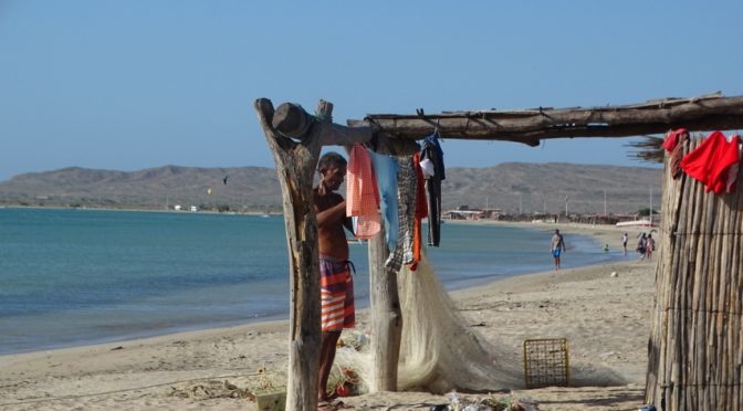 Ici tout fonctionne avec des groupes électrogènes alors qu’à 1km les éoliennes tournent et retournent mais c’est pour la ville. Rien n’est prévu pour la population très pauvre de la Guajira. Un allemand a installé ici une école de kite surf et visiblement c’est une affaire qui marche.