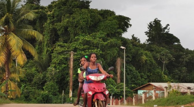 Ah, le chant du coq qui vous arrache de vos rêves prématurément ! Pour moi point de rogne contre Miloud, le coq de Sébastien, car cela signifie que nous avons atteint notre destination. Parties de Paris avant-hier matin ce début de voyage ne fut, à travers le champagne de l’avion jusqu’au planteur d’hier soir, qu’une succession de boissons et de plats. Autour de ces mets délicieux, de nouvelles rencontres et de franche partie de rigolade nous ont glissées progressivement de notre culture métropolitaine à celle des businenge (ce sont les noirs marons qui vivent le long du fleuve Maroni, le terme maron vient du verbe maronner qui signifie s’échapper de sa plantation pour un esclave) en passant par la créole. Sébastien, dit Séba, le fils de Dominique, notre compagne de séjour guyanais, nous a cueillies à notre sortie de l’aéroport pour nous conduire directement chez Magali et Pierrot. Très rapidement le sens de l’accueil de nos hôtes et leur bienveillance nous a fait l’effet d’une soirée entre vieux potes. Pas sans effet secondaire, cette rencontre qui a décalé quelque peu notre départ vers Apatou. Une visite furtive de Cayenne où les maisons créoles côtoient les vielles bâtisses coloniales le long d’un littoral jonché de pierres plates. La végétation luxuriante et les gens assis sur une vieille chaise plastique sur leur pas de porte contribuent à rendre l’atmosphère paisible et donne l’envie de se poser plus longtemps afin de se fondre dans le paysage. Pas de temps pour ça et du coup pas de photos en douce mais juste des bonjours largement rendus. La route qui nous conduit jusqu’à Sinnamary, lieu conservé en mémoire par Dominique pour son restaurant (j’ai enfin une copine de casse croûte) n’est bordé que de végétation très dense d’où s’échappent de-ci delà des entrées de kampu, hameau constitué de maisons familiales. La Covid est passée par là et les restaurants ouverts sur Cayenne ne sont pas représentatifs de la réalité guyanaise. Bon on range notre faim le temps d’atteindre Iracoubo, village avec un check point d’identité pour pénétrer l’ouest du pays. Ce sera notre première bière locale, la Barbo bière de riz du Suriname, accompagnée d’un sandwich et de loempia, espèce de nems de légumes excellents. Direction Saint Laurent du Maroni, visite éclair de l’extérieur du bagne dont les bâtiments sont fermés, achat de nos hamacs brésiliens, des légumes pour le dîner et direction la maison de Séba à 60 kilomètres de là. L’ambiance ici change, la peau des habitants se noircit et la langue n’est plus le créole mais le takitaki, un créole anglais sur une syntaxe africaine que Séba parle couramment. Nous y voilà, la voiture n’a toujours pas le moteur coupé que ses quatre enfants apparaissent heureux de revoir leur grand-mère et ravis d’accueillir les taties. Hé oui nous avons, Martine et moi, pris du grade. Ils sont extras et nous passons tous les 7 une soirée formidable tout en dégustant l’excellent dîner préparé par Sébastien. En bref nous voilà totalement prises en charge à tel point que nous avons omis d’acheter une carte sim surinamaise pour tenter de capter un peu d’internet d’où le silence sur le blog. Aujourd’hui jeudi, la journée est consacrée à l’organisation matérielle de notre départ en pirogue pour 6 jours. Pour le moment elle démarre plutôt sereinement pour moi bien installée dans mon hamac le long du fleuve pour vous rédiger ce premier post. Le passage régulier des pirogues militaires ou marchandes me met déjà dans l’ambiance.