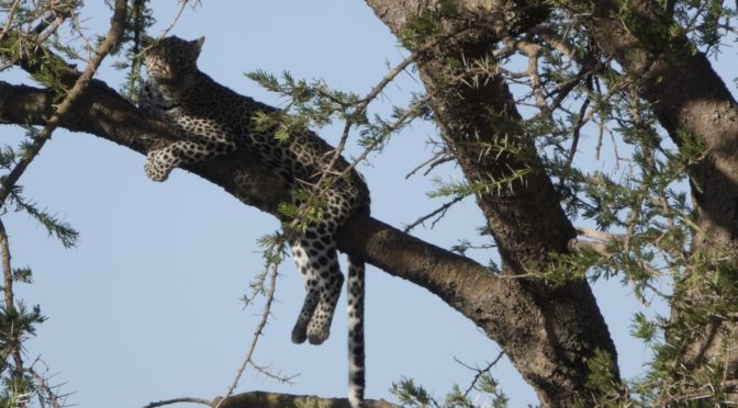 Le jour commence à poindre, je dors encore que Martine commence le safari depuis le balcon de la chambre en admirant le défilé d’un troupeau d’éléphants. Allez debout pour le petit déjeuner avant d’entreprendre notre ballade de 3h en compagnie de Manu, Amir notre guide spécialisé du secteur et de notre ranger d’hier soir. On oublie une visite éventuelle à nos lions amoureux. Le ranger veille à ce que nous ne croisions pas de félins et fusil armé sous le bras, il nous devance et anéantit tout espoir de rencontre fortuite. Il tient également à l’œil les buffles et nous fait évoluer dans un rayon suffisamment large pour ne pas empiéter sur leur territoire. Ce sera donc une promenade enrichissante en connaissance de végétation et de comportement animal. Et l’occasion, surtout, de se déverrouiller les jambes dans un cadre somptueux en compagnie des gazelles et de deux tortues léopards. Pause déjeuner et nous reprenons le chemin du parc du Sérengeti. Sans commentaire je vous laisse découvrir les images de cette splendide journée. Juste pour info, le léopard perche sa proie pour éviter de partager sa gazelle avec les autres mais surtout pour être peinard. Si il commence à la manger à terre et que des hyènes, chacals ou autres profiteurs s’approchent il préfère leurs abandonner sa proie. Autre précision , je vous ai écris que seules les lionnes du lac Manyara se perchaient dans les arbres mais visiblement elles ont refilé l’information aux lionnes du Sérengeti ! Après cette journée bien remplie nous arrivons à notre nouvel hébergement la nuit tombée. Nous sommes en plein cœur du parc avec un balcon et une salle de bain sur la nature, le rêve. Le hic c’est que nous devons nous faire accompagner par un massaï pour regagner notre chambre ou en sortir. Soirée très sympa avec Manu et Joël avec qui nous prenons tous nos repas et surtout partageons le vin.