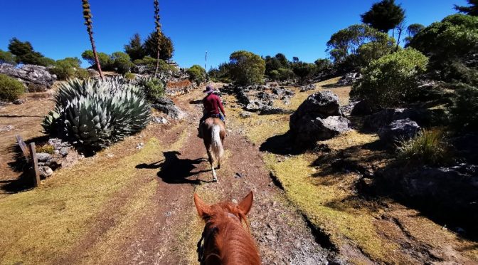 Martine ouvre le volet et zut le soleil est déjà levé; vite! en mode pyjama, j’enfile un blouson, je saute dans mes chaussures et en avant. Pauline nous a bien précisé que si l’on voulait voir les volcans depuis le mirador (enfin en haut de la colline) il fallait arriver avant que la brume ne se lève complètement. En chemin je croise Florence, Didier et Joseph, leur fils qui sont déjà sur le chemin du retour. En dix minutes je gravis les 1000 mètres qui me séparent du sommet. J’avoue qu’au saut du lit c’est difficile, mon cœur s’emballe mais l’envie d’admirer au loin le volcan Fuego en éruption m’engaillardit. C’est que nous sommes à 3000 mètres d’altitude, le froid de la nuit a déposé son givre et l’oxygène semble manquer. Et voilà finalement je ne rate rien du spectacle magique que de se sentir sur le toit du monde. Retour avec un direct dans la douche et à l’heure pour le petit déjeuner. Ce ranch dont l’authenticité passe par l’humanité de Pauline et Fernando et l’absence de chauffage est également un haut lieu de la gastronomie. Hier soir nous avons renoué avec de la cuisine française exquise et ce matin cela recommence. C’est le ventre plein que nous, Didier, Joseph, Pauline, un des gars du Ranch et moi, partons pour une belle randonnée au cœur des Cuchumatans, chaîne de montagne qui commence depuis le Chiapas au Mexique. Pendant ce temps Florence et Martine partent visiter la bibliothèque née d’un des projets visant le développement par la culture des minorités locales initié par Pauline et Fernando. Puis elles enchaînent par une balade à pied. Ici, c’est le luxe, le cheval, Balzane pour moi, est scellé, brossé et en plus on vous le ressangle. Il ne reste plus qu’à profiter. De retour au ranch, un petit verre de vin en attendant le déjeuner et le super dessert style far breton à la banane. Excellent ! Il est plus de 14h et une longue route nous attend si nous voulons réussir à attendre Xela, soit Quetzaltenango avant la nuit. Cette belle journée se poursuit. Fernando doit se rendre à Huehuetenango pour acheter de la nourriture pour les chevaux. Formidable il nous embarque dans sa camionnette et au lieu des deux heures en buseta nous y parvenons en 45 minutes. Gentiment il nous dépose à la gare des camionetas (ce sont d’anciens bus scolaires américains magnifiquement colorés) et nos sacs sont directement pris en charge par l’aide du chauffeur qui les hisse sur le toit pour un départ illico. Première expérience de ces bus et bien ça décoiffe. Devant chaque siège une barre métallique permet de s’accrocher et tout le monde s’y emploie. Nous ressentons une impression de vitesse permanente due aux chaos et à l’alternance des accélérations et des coups de freins brutaux mais au final la demi-heure de route annoncée par Fernando en a pris deux. Avec l’arrivée à Xela au milieu de la frénésie des camionetas, le bruit et la circulation, la sérénité de Unicornio nous semble déjà loin. Nous dégotons une auberge de jeunesse à proximité de la place centrale dont le toit terrasse nous apporte un peu de réconfort. En papotant avec la vieille dame maya qui vend des frites en tenue traditionnelle comme je vois qu’elle baille je lui demande ses horaires de travail. Simple, elle ouvre à 4H du matin et ferme à 20H sans interruption et ce 6 jours sur 7. Ensuite il lui faut nettoyer et ranger. Ça calme !