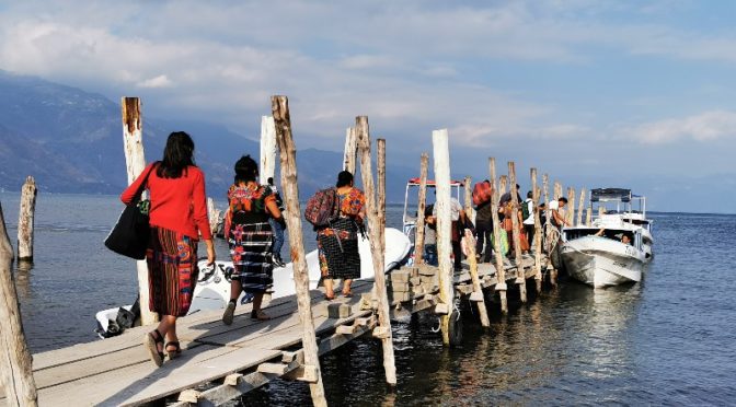 A savoir, le lac Atitlan a été formé il y a 85 000 ans lors d’une énorme éruption volcanique qui a projeté des cendres de la Floride à l’Équateur. C’est le lac le plus profond d’Amérique Centrale avec ses 350 mètres. Une des randonnées incontournables du lac consiste à grimper sur le nez de l’indien. L’indien, c’est la photo de la montagne à l’envers que je vous ai jointe. Normalement celle-ci s’effectue au lever du jour avec un départ à 3h du matin. Pour nous ce sera un démarrage avec Lucas notre chauffeur tuktuk à 8h30. Non mais ! le petit déjeuner c’est sacré. Direction les différents petits villages accrochés à la montagne pour rejoindre le départ de la ballade. Enfin pas si simple le démarrage, notre Lucas ne connaît pas grand-chose alors il s’arrête chez lui pour demander la direction à sa sœur qui au final embarque avec nous. Nous arrivons sur le chemin du point de vue, aidé par notre GPS je repère un belvédère 100 mètres plus bas et dont l’accès semble gratuit. Nous sommes dans la zone fréquentée par des pirates de chemin qui rançonnent les touristes non accompagnés. La sœur de notre chauffeur qui n’a de cesse de nous claironner qu’elle est guide ne m’inspire aucune confiance et passe son temps à trouver des combines pour augmenter notre prix de journée déjà négocié avec son frère. Je vois deux gars du coin qui sortent du sentier, je pars leur parler. Évidemment ils se présentent comme les propriétaires des lieux et contre une modique somme se proposent de nous conduire. Allez hop c’est parti avec eux et nous laissons nos gardiens de tuktuk sur place. Mikaël, Racinto et Panch le chien font office de supers guides et gardes du corps en même temps. Racinto me précise qu’avec sa machette nous sommes en sécurité mais qu’en général les pirates guettent les touristes au lever du jour, comme quoi c’est une bonne idée de petit déjeuner avant de partir. Ils sont fermiers en tout genre et actuellement c’est la récolte du café. Les endroits les plus escarpés sont aménagés avec une corde qui facilite grandement la grimpette. Nous allons passer de mirador en mirador mais nous nous contenterons de la bouche de l’indien. Le nez nécessitant de la crapahute à risque de là où nous sommes. Retour au point de départ où nos zozos nous attendent. Nous rebroussons chemin en prenant le temps de circuler dans les ruelles qui nous dévoilent sans cesse de belles scènes de vie mais sans photos par respect. Une fois à San Juan l’ambiance chauffe dans le tuktuk ; la frangine a une nouvelle fois inventé une taxe que je m’empresse de vérifier auprès de la population. Cette fois-ci s’en est trop, je donne à Lucas ce que je lui avais promis et nous décidons de finir seules la découverte du village avec l’intention de rentrer à pied à San Pedro. Finalement nous utiliserons les services d’un autre tuktuk pour franchir la zone de route non revêtue pour éviter un bain de poussière. Déjeuner tardif à la cantine du marché de San Pedro qui s’avère correct sans plus en comparaison de celui de Xela. Retour à notre hébergement pour boucler nos petits sacs car je viens d’avoir le guide du tour pour demain et comme il part de Santiago à 6h du matin, hé oui là il n’y a pas le choix. Nous devons donc nous y rendre pour dormir. Pratique nous avons deux logements ce soir. Il fait chaud, les oiseaux gazouillent au-dessus de la tête de Martine qui somnole dans le hamac pendant que je vous écris avec une petite bière. Le bateau part à l’autre bout de la plage, il est temps de se mettre en route. Pas le temps de récupérer nos vêtements déposés à la laverie ; en même temps cela tombe bien car on ne se rappelle plus de la rue comme c’était en tuktuk ce matin. Au pire je rappellerais Lucas ! Nous voilà embarquées, le bateau affiche complet. Une demi-heure de traversée et nous posons un premier pied à Santiago qui au premier abord semble sans intérêt. Les vestiges d’un parc avec ses différents espace de convivialité noyés en partie dans le lac sont les témoins de l’époque où les eaux du lac étaient plus basses de 5 mètres. Repérées par Pablo, un chauffeur de tuktuk, nous acceptons ses services. En sa compagnie nous avons visité plusieurs chambre d’hôtel avant d’en choisir une en plein centre tenue par Suzana, une femme adorable. Ensuite notre super Pablo nous a organisé une visite guidée de sa ville avec beaucoup d’émotions sur l’histoire de celle-ci et évidemment de son peuple Maya. Pas le temps de tout vous conter, alors en bref, le moine San Francisco qui a aidé la population en sauvant des enfants a aujourd’hui son cœur enterré dans l’église. Nous sommes passés par la place de la Paix où ont été exécutés les derniers martyrs maya en 1990. C’est ici à Santiago qu’a été signé le premier traité de paix grâce à une mobilisation de toute la population. Ensuite, l’effet boule de neige a mis 6 ans à gagner l’ensemble du pays. Ce que je vous raconte ne vaut rien mais sortie de la bouche et des tripes de ce garçon qui tient l’histoire de la ville de ses parents c’est juste de l’émotion. Un passage à la laverie locale toujours dans le lac mais juste à côté d’un bâtiment flambant neuf que les femmes refusent d’utiliser. À présent qu’elles disposent toutes de l’eau courante à la maison, elles ne perçoivent pas l’intérêt d’aller se renfermer dans ce hangar alors qu’elles peuvent laver chez elles. En revanche le lac, c’est conserver les coutumes et surtout le lien social. Et linge ou pas elles se retrouvent tous les soirs. Notre dernière visite fut pour le grand-père bien aimé, Maximón (Rilaj Maam pour les mayas ou San Simon pour les espagnols). C’est une divinité vénérée dans toute la région des hautes terres, à l’origine les différents sages se sont retrouvés pour invo