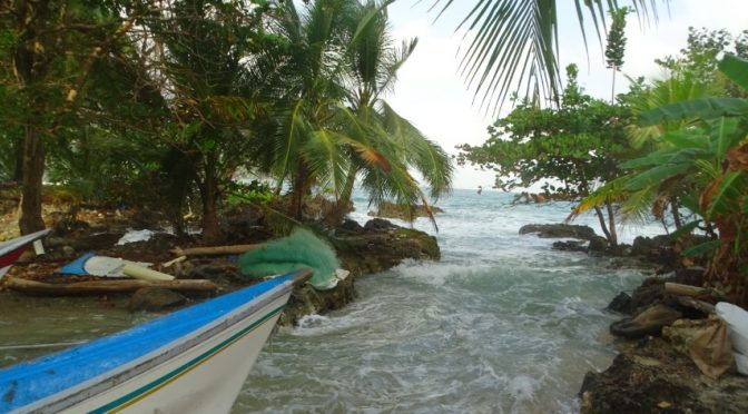 Les escaliers en béton démarrent à peine 10 mètres après notre hébergement qui se trouve être la dernière maison du village. En moins de 10 minutes nous voilà déjà au Panama ! Vu comme ça ce n’était pas la peine de partir si tôt. Premières à passer la douane, personne au poste de frontière. Nous arrivons au village constitué d’une trentaine de maisons et comme nous n’allons pas nous enfoncer dans la jungle, nous prenons la route de la plage. Là nous passons devant un militaire assis tranquillement sur un banc à côté de son pistolet qu’il range à notre approche. Passeport s’il vous plait. Voilà voilà, et là il note les informations sur une feuille de brouillon avant de les recopier de sa belle écriture sur une feuille d’écolier où il a pris soin de tirer des lignes à la règle afin de noter la date du jour. Un autre militaire sort avec le drapeau du Panama sous le bras. Là notre greffier à présent à l’extérieur nous demande de nous lever et tous les trois nous assistons au lever des couleurs. Passeport en poche nous poursuivons notre chemin vers la plage. Ici comme du côté colombien, la mer loin de ressembler à la piscine naturelle d’un bleu profond décrite dans les guides est complètement agitée et affiche une visibilité plus que réduite. Pour la version lagon bleu, il faut venir en octobre et éviter décembre où les gens sont restés près de 15 jours bloqués. J’espère que vendredi notre bateau pourra à nouveau traverser le golfe car depuis hier les conditions ne vont pas en s’arrangeant.