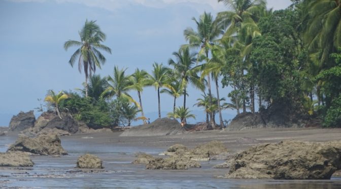 Vers 9h30 ou 10h( en fait on vit sans montre) on quitte Ernestine. Allons voir plus loin si l’herbe est plus verte. Comme c’est dimanche le service bus lancha ne fonctionne pas. C’est parti pour la marche à pied. On longe cette plage magnifique traversée par une multitude de rios. Les rochers parsemés de végétation qui semblent flotter sur l’océan à marée haute donnent un air de labyrinthe à notre excursion à marée basse bien-sûr. Car nous sommes en phase de pleine lune et à marée haute la plage disparaît totalement. Nous voilà à destination après environ deux petites heures de marche, enfin c’est ce qui était prévu. Les premiers hôtels dissimulés dans la végétation ne nous attirent pas et de toute façon nous allons dans le secteur du spot de surf où logiquement un hébergement bon marché pour le coin doit pouvoir se trouver. On passe devant un lodge au jardin luxuriant. Je vois bien qu’une dame me fait signe. J’y vais et lui dis que l’on cherche un hébergement. Elle me propose « ici » mais je lui explique que ce n’est pas dans nos tarifs. Elle me répond « on va trouver un arrangement… » Et nous voilà seules clientes de ce lodge à 3 fois moins cher que le prix officiel et 2 fois moins que l’hébergement des surfeurs. Que demander de plus ? C’est juste parfait. Comme logiquement c’est fermé, on ne fait pas les difficiles et on propose de manger comme eux. Et bien nos deux premiers repas ont été excellents car en plus d’être sympathique, Manuela est une excellente cuisinière. Ici pas de village juste de la plage et du surf pour demain. Car les vagues sont là au grand dam des pêcheurs qui rentrent bredouilles. Ici la pêche c’est en petite barcasse de bois et à la rame alors le large on oublie.