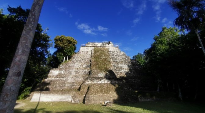 5h30 aujourd’hui ce ne sont ni les singes, ni l’horloge qui nous réveillent mais les gouttes de pluie qui s’abattent sur la toiture. Notre petit paradis change de couleurs et nous semble bien fade ce matin. La température, elle, reste clémente. Petit déjeuner tranquille et nous profitons de l’absence de baignade pour étudier un peu la suite du programme. Mon genou a tranché et nous oublions avec regret cette excursion de 5 jours dans la jungle. Sympa, la pluie cesse pour notre départ vers Yaxha. Cette citée constitue la pièce maîtresse du projet de « triangulo cultural» (triangle culturel) de Nakum-Naranjo-Yaxha. Encore une belle randonnée à oublier ! (elle permet de relier ces trois sites.) C’est donc accompagnées de deux femmes panaméennes que nous prenons un minibus pour rejoindre le site. Une demi-heure de route suivie d’une heure de piste, Juan notre chauffeur ne semble pas être un as du volant, il nous aura fallu trois essais pour réussir à gravir une des côtes de la piste rendue glissante par les précipitations. Enfin malgré les slaloms de glisse Juan s’en sort mieux que le tout jeune chauffeur qui lui a terminé au fossé. Bon nous avons accueilli ses passagers pour finir le trajet. N’étant pas enthousiasmées par le guide qui nous était octroyé, nous avons fait le choix de soudoyer un des gardiens du site. Santiago nous a permis de ne pas nous perdre, de passer par des endroits secrets et de braver des interdits. Ce qui m’a bien plu mais reconnaissons tout de même que nous en avons plus appris sur les arbres et leurs utilités chez les mayas que sur l’histoire de Yaxha. Mais cela m’a emballée. Nous avons récupéré des plantes pour soigner les maux de ventre, découvert les feuilles d’un arbre qui se fument avec des effets similaires à la marijuana, senti des feuilles de pimiento, fait brûler de la sève d’un arbre qui dégage l’encens local qui sert aux cérémonies mayas et j’en passe. Nous avons admiré des toucans, des singes araignées qui nous ont fait des numéros de cirque et évidemment le site regorgeait de singes hurleurs et de perroquets verts. Il nous a dit que la nuit jaguars et cerfs s’observaient sur le site. Comme Santiago a contribué au travail du nettoyage du site avec les archéologues, il a su nous montrer les différents niveaux de construction puisque comme partout chaque successeur érigeait un niveau de temple supérieur. Il nous a expliqué ce que nous ne pouvions pas voir car resté sous terre et également que l’accès au lac a été construit sur les marches de l’époque afin de les protéger. Et qu’au moment des fouilles les archéologues ont découvert l’existence d’une guérite qui permettait un contrôle des gens qui arrivaient par le lac. Avec mon genou j’ai renoncé à descendre pour aller rendre visite aux crocodiles qui habitent l’endroit mais, comme il nous a dit qu’un français imprudent y a laissé une jambe, nous avons peut-être bien fait de rester perchées… À attendre un coucher du soleil un peu raté nous sommes rentrées à l’hôtel juste avant la fermeture des cuisines, il était temps. Belle fin de soirée avec nos compagnons français d’hier et malgré l’étude de ce matin, nous n’avons toujours pas arrêté le programme de demain.